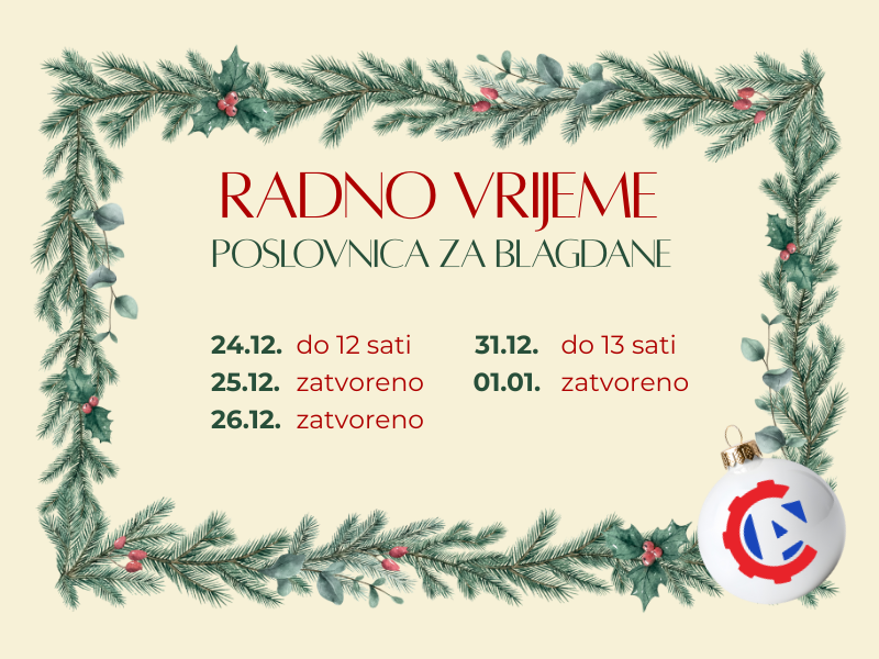 Radno vrijeme CIAK Auto poslovnica za blagdanePoštovani kupci,obavještavamo vas o radnom vremenu poslovnica CIAK Auto tijekom blagdana: 24.12. – do 12 sati 25.12. – zatvoreno 26.12. – zatvoreno 31.12. – do 13 sati 1.1. – zatvoreno Ovim putem želimo vam zahvaliti na povjerenju koje ste nam ukazali u ovoj 2025. godini. Želimo ... Saznaj više