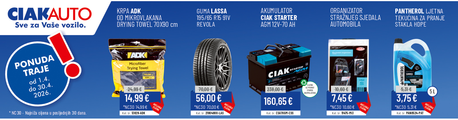 Nova CIAK Auto poslovnica otvorena u Benkovcu!Poštovani kupci, obavještavamo vas da smo otvorili poslovnicu CIAK Auto u Benkovcu! Posjetite nas na adresi: Ulica kralja Dmitra Zvonimira 20, Benkovac. Radno vrijeme poslovnice: Pon-Pet: 08:00 – 19:00 Subota: 08:00 – 13:00 Mob.: 091 456 7261 U novoj poslovnici možete pronaći širok asortiman auto dijelova, ... Saznaj više