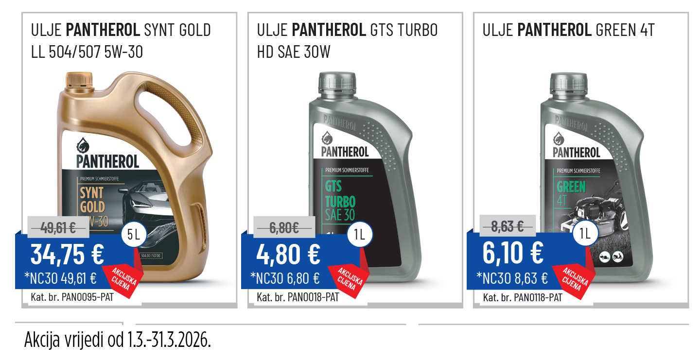 Njemački brend Pantherol nudi asortiman motornih ulja za osobna i komercijalna vozila, poljoprivrednu mehanizaciju i strojeve, kao i industrijska ulja i masti.